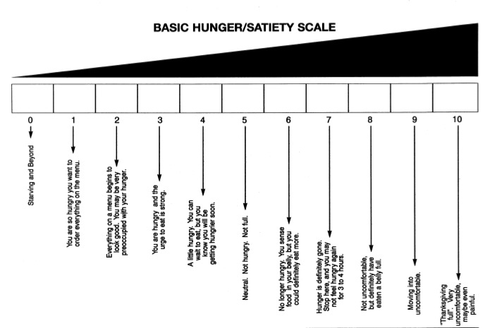 1) Eat during the day. Skipping breakfast and/or lunch before Thanksgiving dinner makes it much more likely that you eat way beyond fullness. Look at the scale below. Starting off at one end of the scale increases the likelihood of ending up way at the other end of the scale. Generally speaking (like, not on Thanksgiving), you want to stay closer to the middle, between a 3/4 and 6/7 or 8. And while a 6 or 7 isn't necessarily realistic for tomorrow, going into the meal at a level 0, 1, or even 2 decreases mindfulness and increases ravenous-ness (which I've officially just made a word), bringing you quickly to a level 9 and above on the scale.